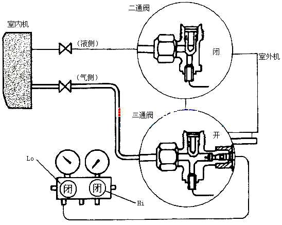 (9)拆卸室内、室外装置,连接配管的管道,和室内外的连接电线(二通阀、三通阀保持关闭状态)。